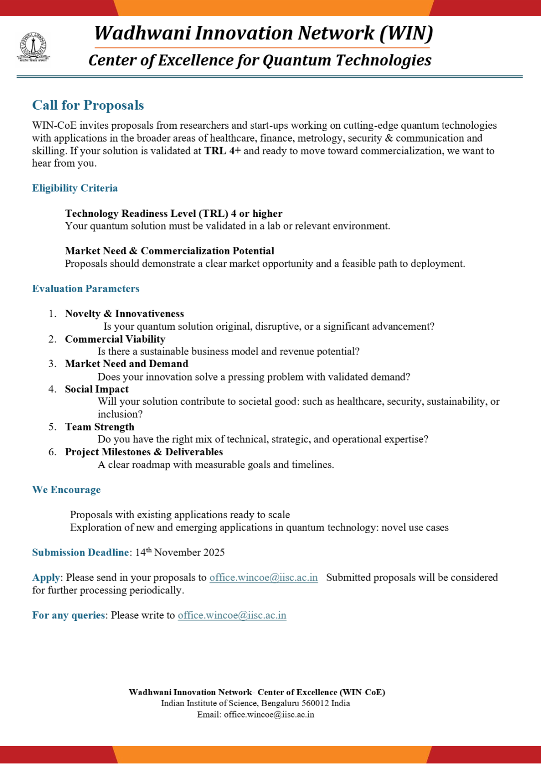 Apply: Please send in your proposals to office.wincoe@iisc.ac.in with a copy to prashanthu@iisc.ac.in.