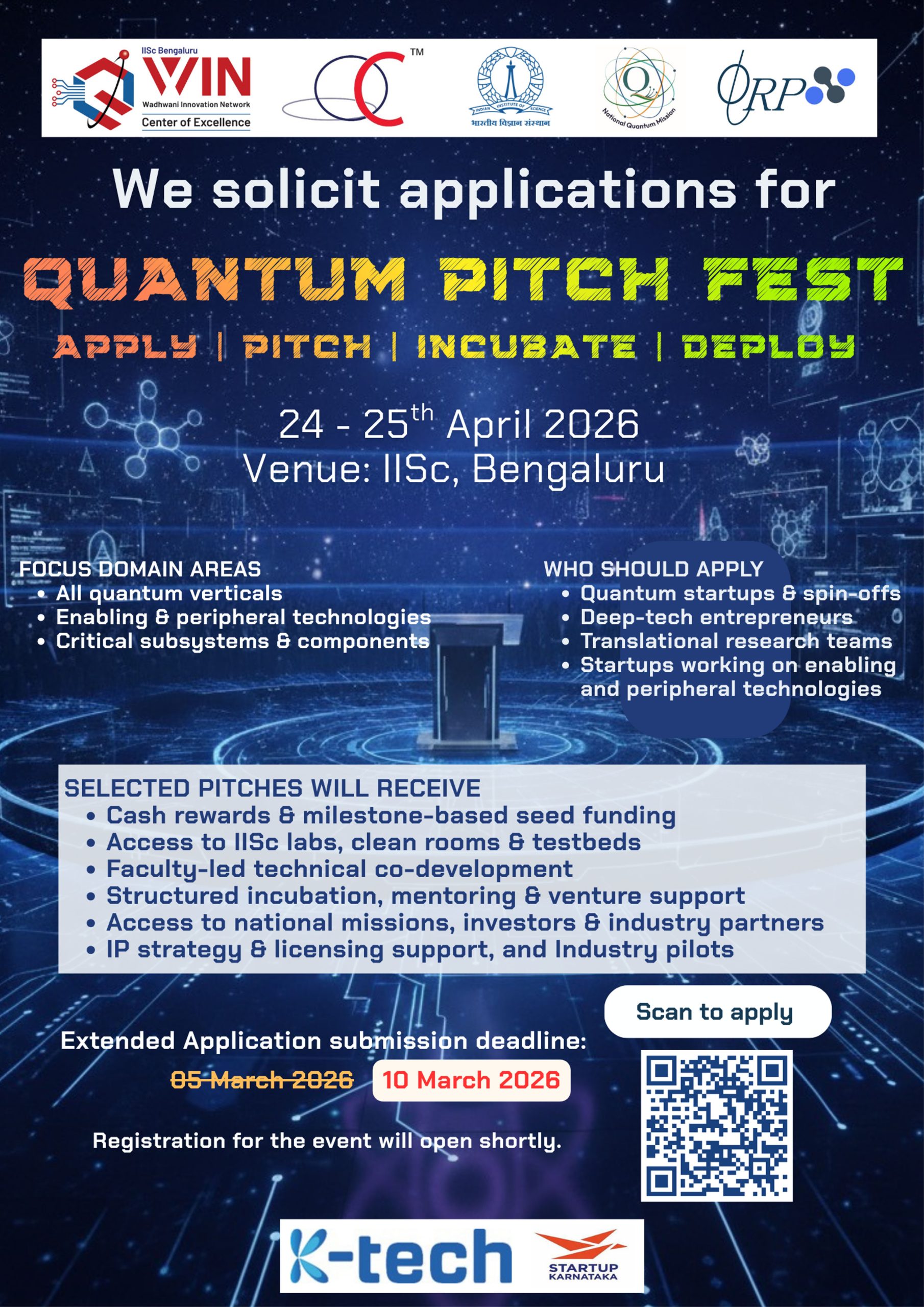 Quantum Pitch Fest is a high-impact, curated innovation and investment forum and full-stack venture acceleration platform where selected startups pitch their ideas to leading Venture Capitalists, Industry Leaders, Incubators, and Technology Mentors, and receive end-to-end support to take their innovations from concept to commercialization.